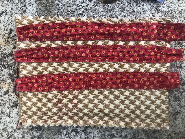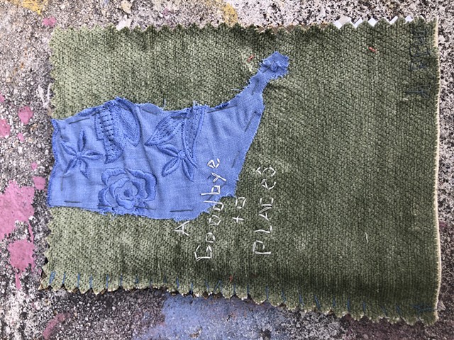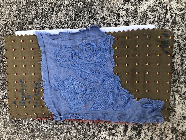 This is an obituary of sorts to people, places and times. Also truly a labor of love. A Goodbye to Places is an edition of 50 chapbooks- the covers handsewn collages of sacred scraps, each hand-embroidered on free-pile fabric wallpaper and carpet samples, hand-bound, typed in the public library, printed, individually cut and glued. Years of scraps housed in drawers and studios and moved from home to home go into each book instead of the trash. This piece is about memory tied to places.